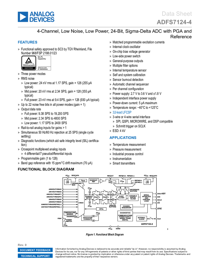 4-Channel, Low Noise, Low Power, 24-Bit, Sigma-Delta ADC with PGA and Reference