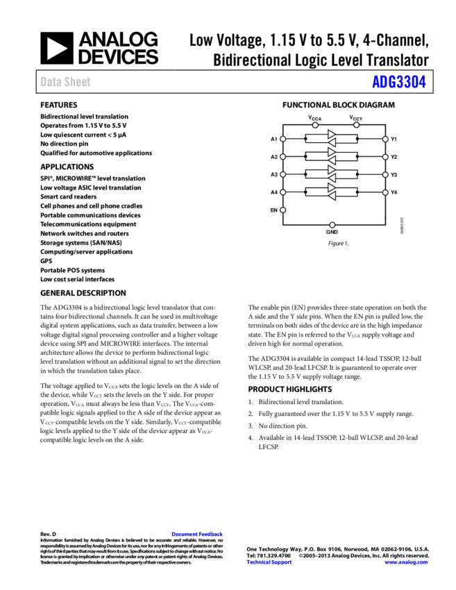 ADG3304: Low Voltage 1.15 V to 5.5 V, 4 Channel, Bidirectional, Logic Level Translator