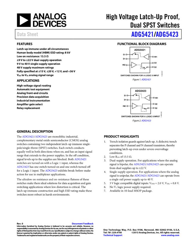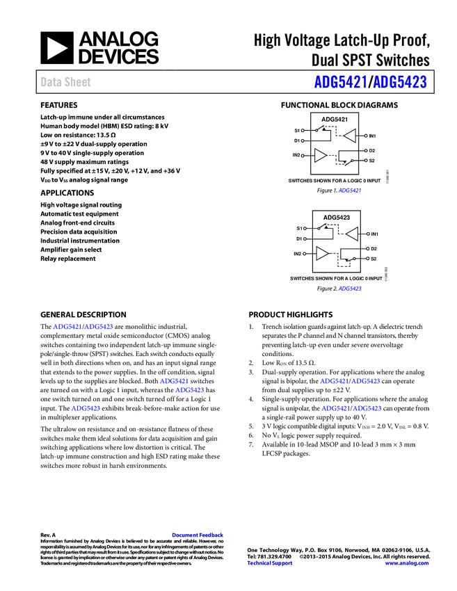 ADG5421: High Voltage Latch-Up Proof, Dual SPST Switches