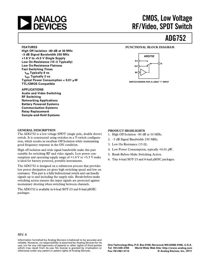 ADG752: CMOS, Low Voltage, RF/ Video, SPDT Switch (Single Pole, Double Throw)