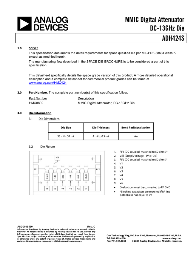 Aerospace 0.1 GHz to 30 GHz, GaAs, MMIC, 5-Bit 0.5 dB LSB, Digital Attenuator