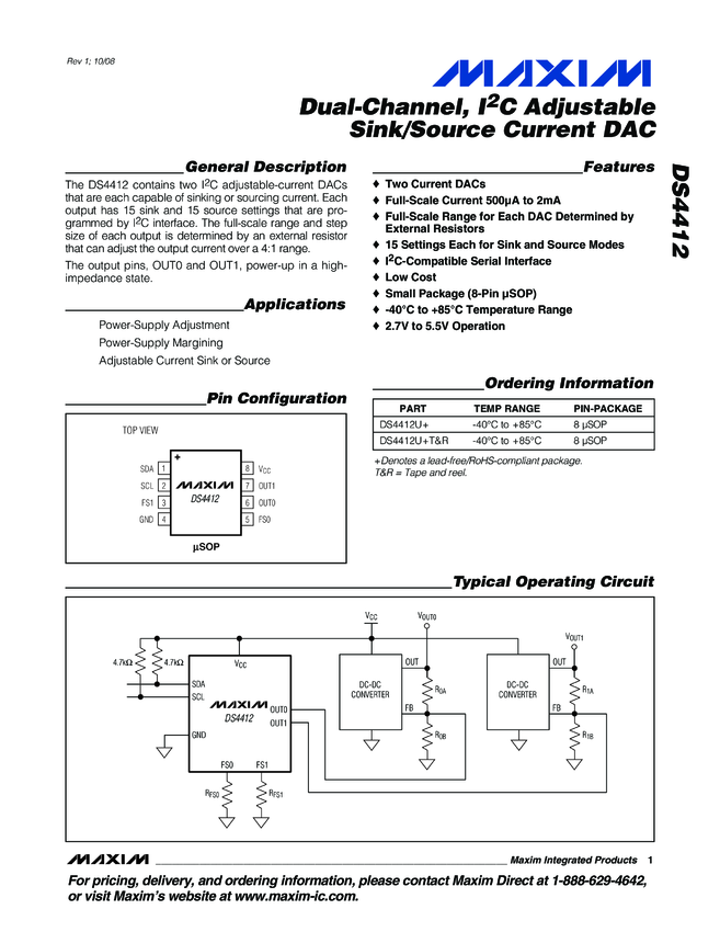 DS4412 Dual-Channel, I²C Adjustable Sink/Source Current DAC
