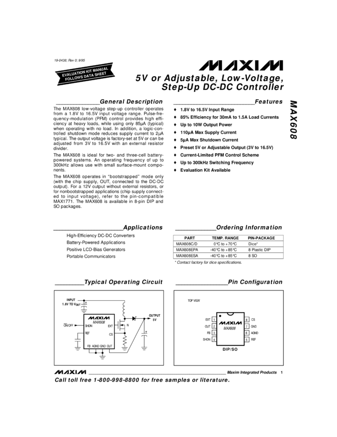 MAX608 5V or Adjustable, Low-Voltage, Step-Up DC-DC Controller
