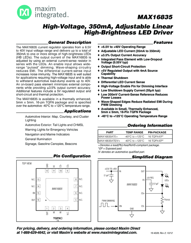 MAX16835 High-Voltage, 350mA, Adjustable Linear High-Brightness LED Driver