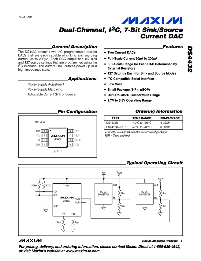 DS4432 Dual-Channel, I²C Adjustable Sink/Source Current DAC