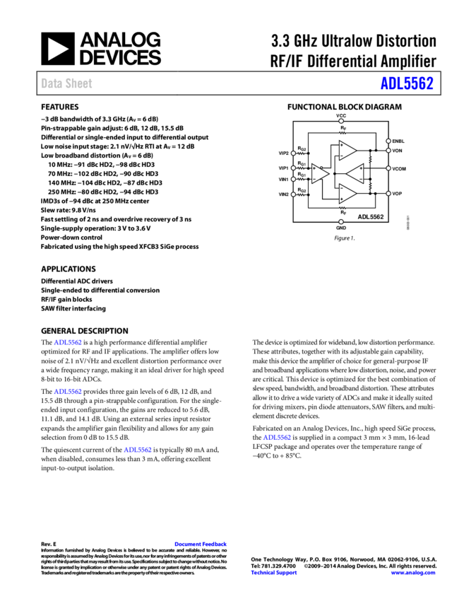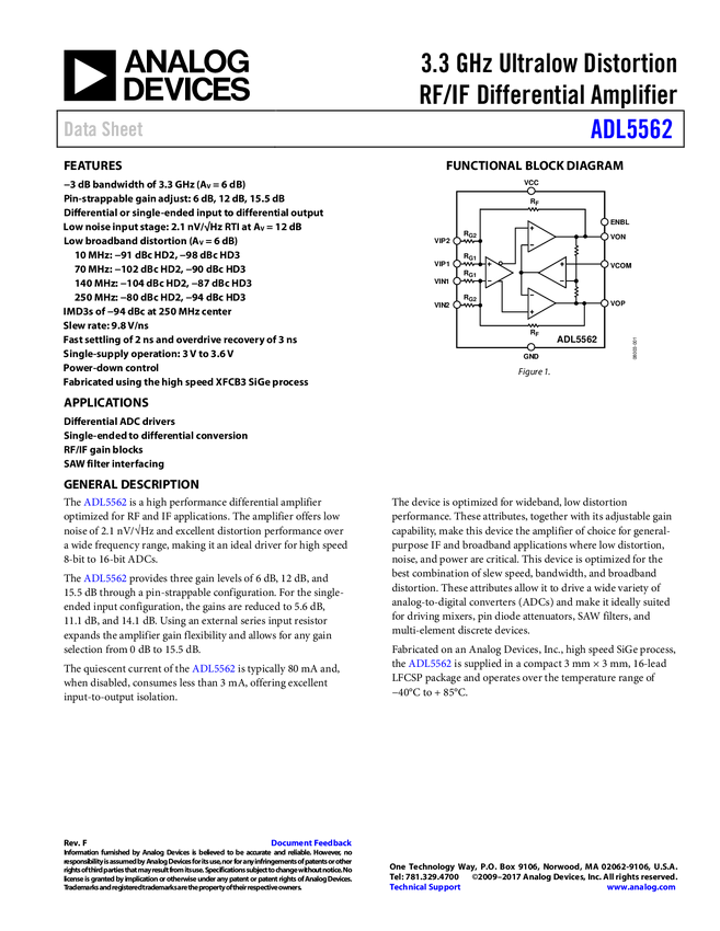 ADL5562: 3.3 GHz Ultralow Distortion RF/IF Differential Amplifier