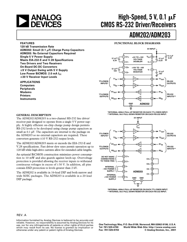 ADM232A: High-Speed, 5 V, 0.1 µF CMOS RS-232 Driver/Receiver Available in 16-lead DIP& in Both Narrow and Wide SOIC Packages