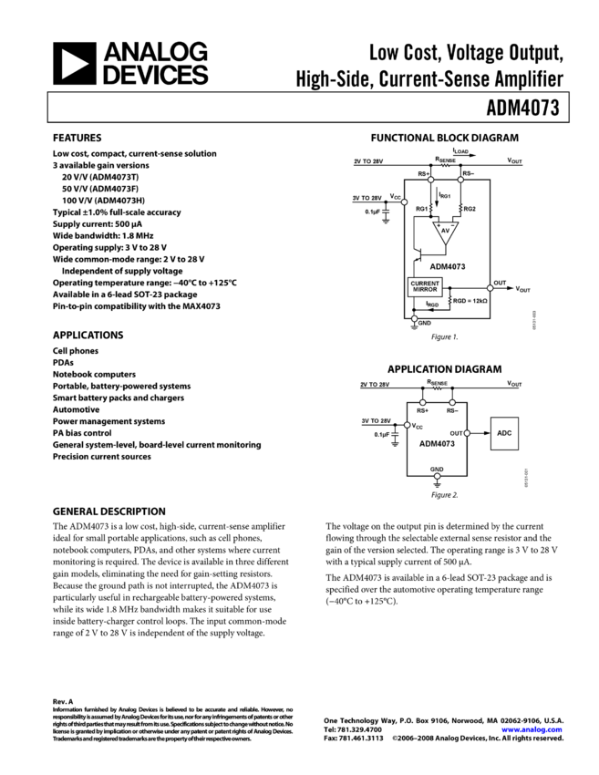 ADM4073: Low Cost, Voltage Output, High-side Current Sense Amplifier