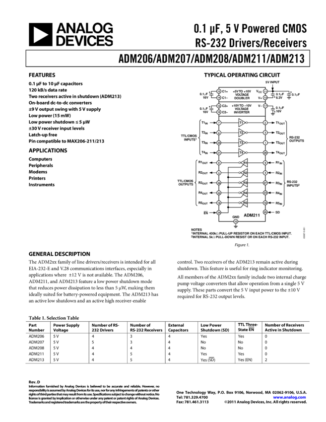 ADM213: 0.1 µF, +5V CMOS RS-232 200kBPS Transceiver with 4 Drivers, 5 Receivers, Shutdown and Enable Pins and 2 Receivers Active in Shutdown