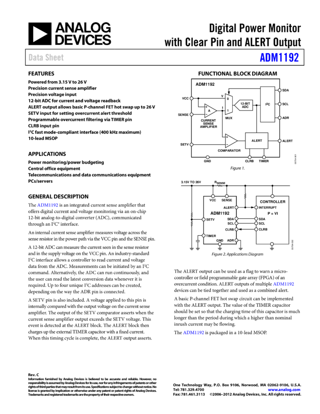 ADM1192: Digital Power Monitor with Clear Pin and ALERT Output