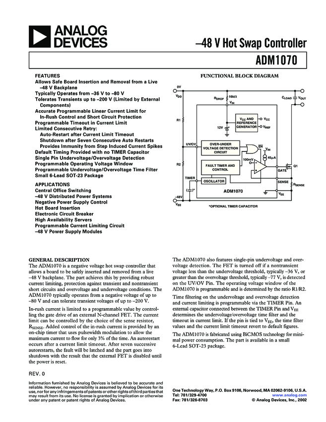 ADM1070: - 48 V Hot Swap Controller in SOT-23 with Linear Current Limiting