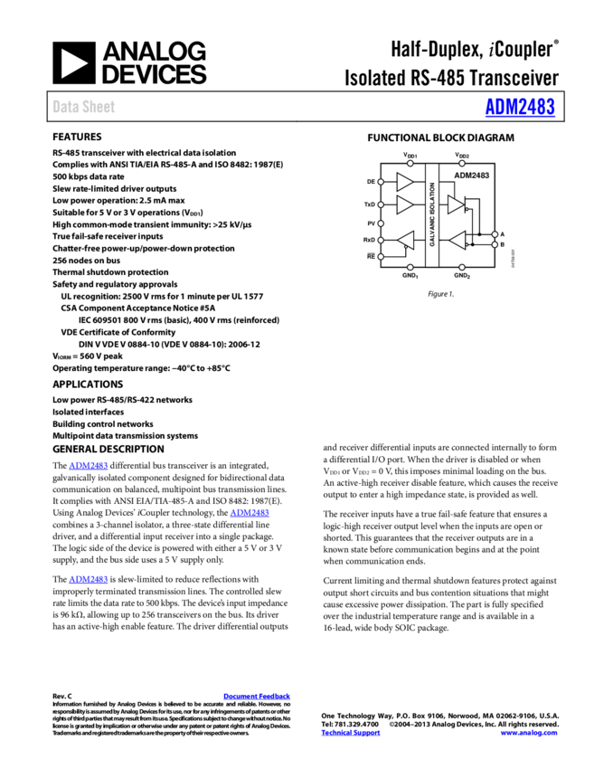 ADM2483: 2.5 kV Signal Isolated, 500 kbps, Half Duplex RS-485 Transceiver w/ Power Valid Input