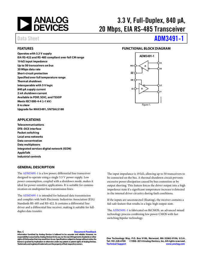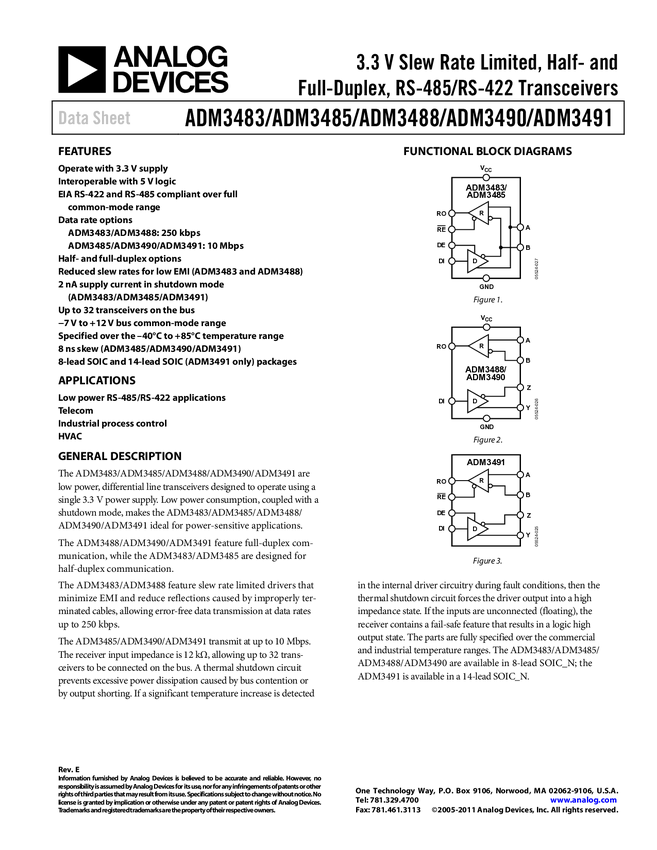 3.3 V, Low Power, RS-485/RS-422 Transceiver (Full Duplex, 10 Mbps)