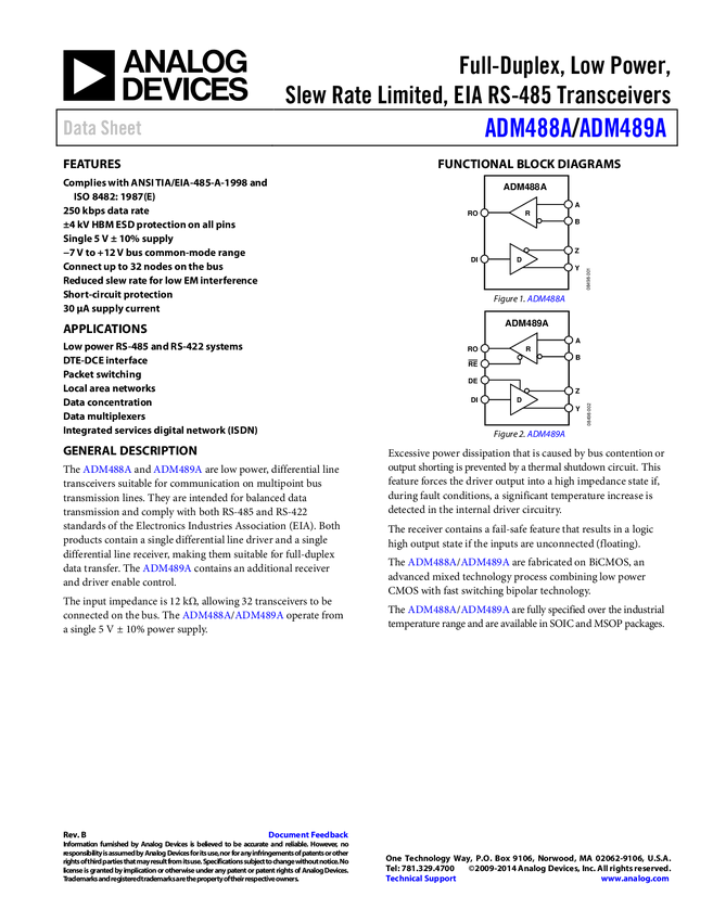ADM489A: 5 V, Slew-Rate Limited, Low Power, 250 kbps, Full Duplex EIA RS-485 Transceiver (with DE/RE)