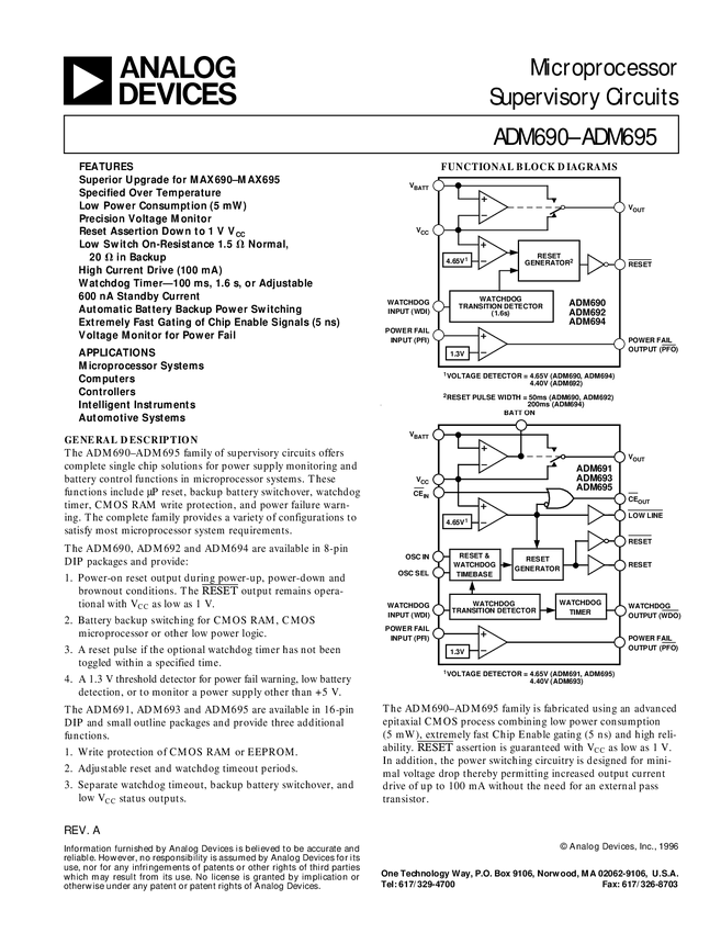 µP Supervisor with Backup Battery Switchover, Watchdog Feature, Power Fail Warning, 4.4V Threshold Voltage, 100mA Output Current. Upgrade for ADM693 with Reduced Power Consumption and Faster Gating of Chip Enable Signals