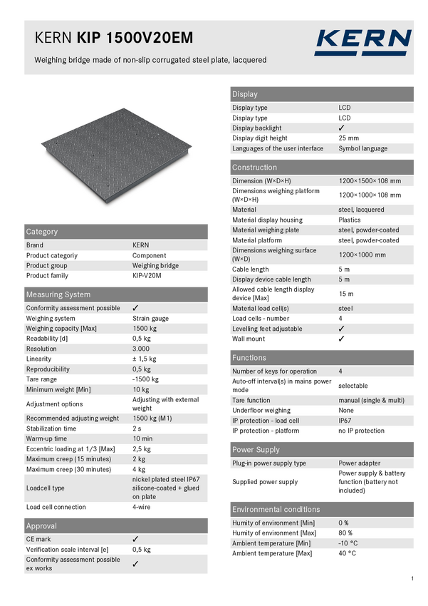 Pomost wagowy KIP 1500V20SM, zakres ważenia 1500 kg, dokładność odczytu 0,5 kg Kern KIP 1500V20SM