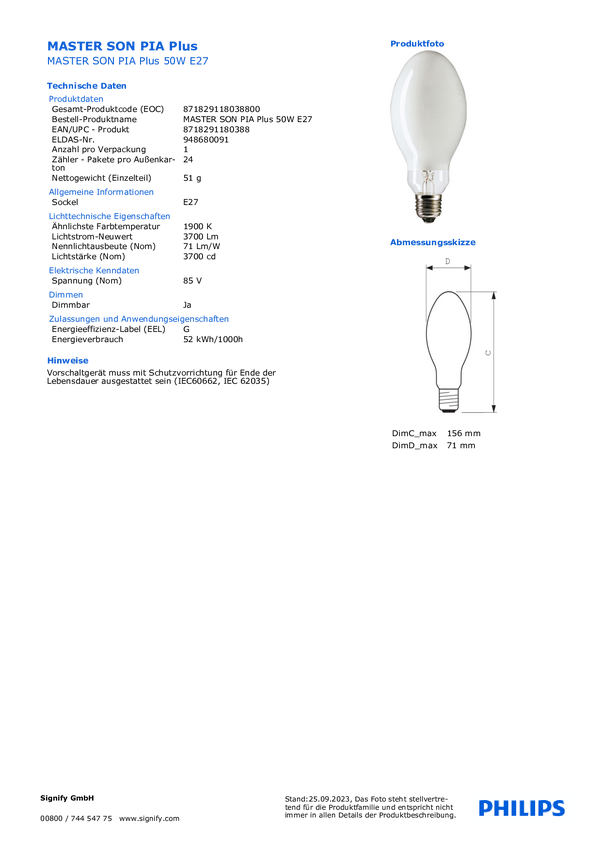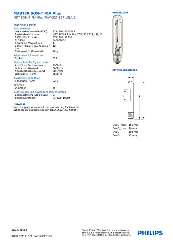 lampa wyładowcza Philips MASTER SON PIA PLUS 18225815, 1 szt.