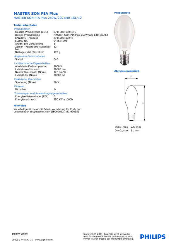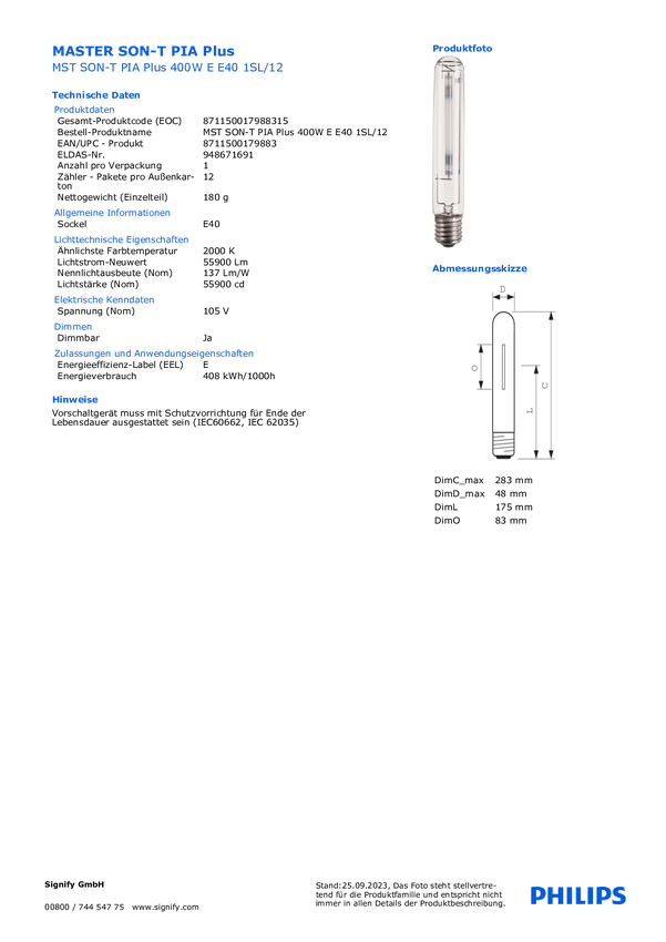Philips lampa wyładowcza MASTER SON PIA PLUS E40 408 W EEK: E (A - G) ciepła biel Kształt reflektora 1 szt.