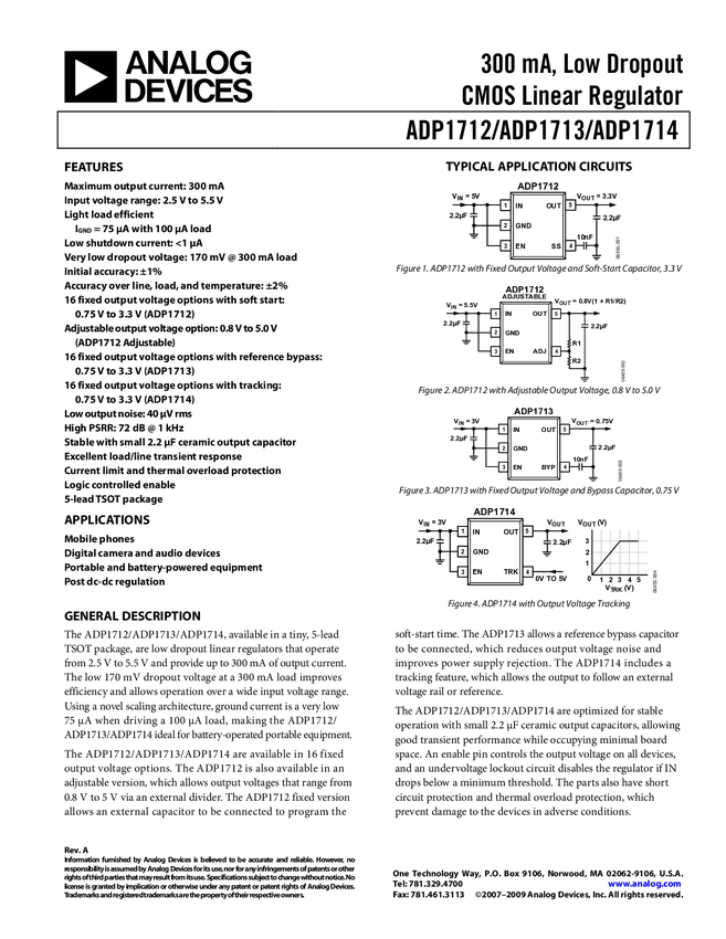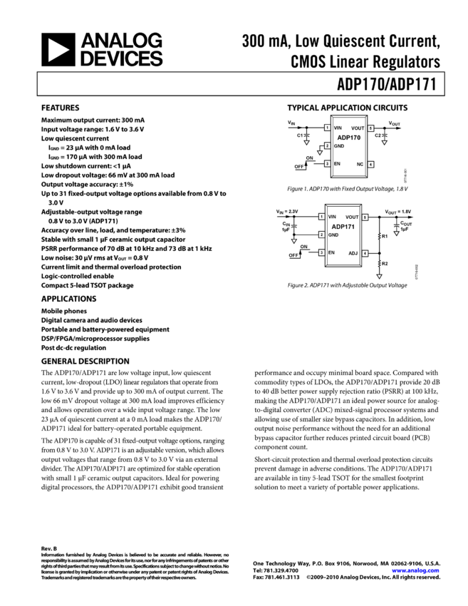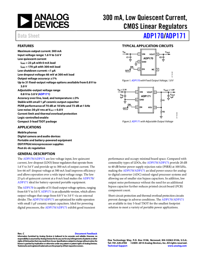ADP171: 300 mA, Low Quiescent Current, adjustable output, CMOS Linear Regulator