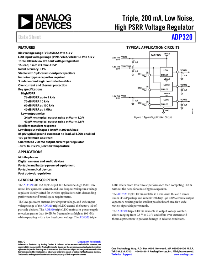 ADP320: Triple, 200 mA, Low Noise, High PSRR Voltage Regulator
