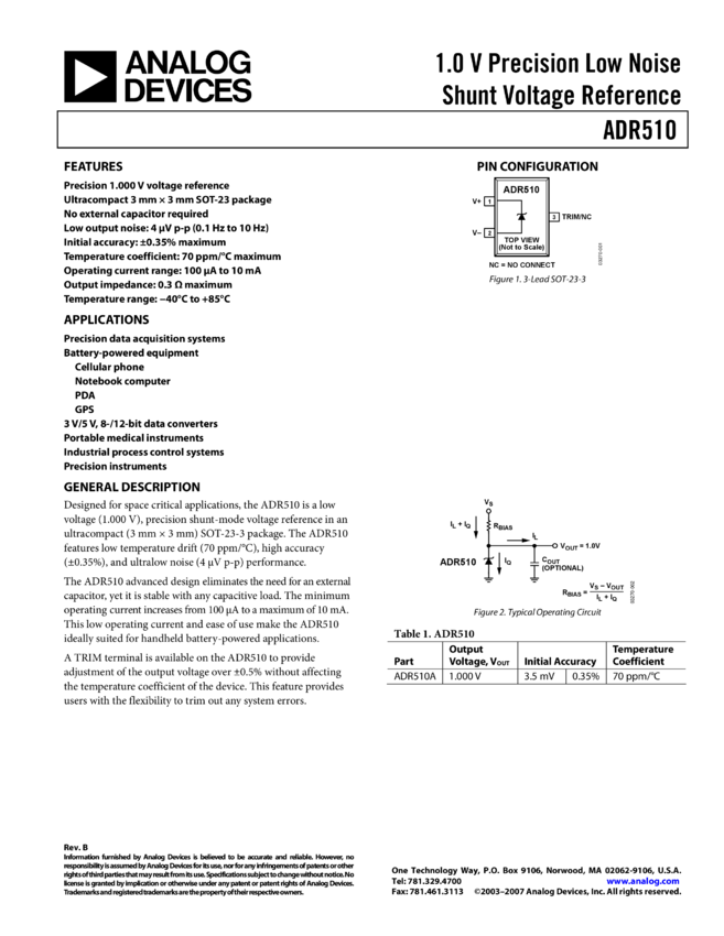ADR510: 1.0 V Precision Low Noise Shunt Voltage Reference