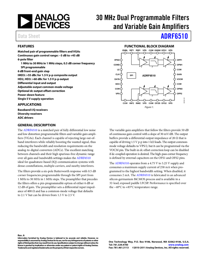 ADRF6510: 30 Dual Programmable Filters and Variable Gain Amplifiers