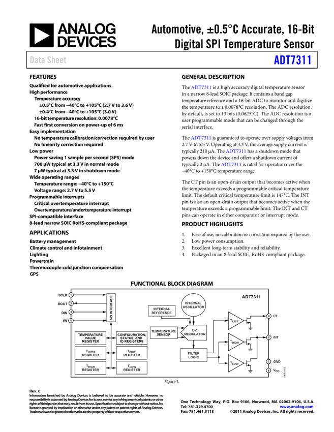 ADT7311: Automotive, ±0.5°C Accurate, 16-Bit Digital SPI Temperature Sensor