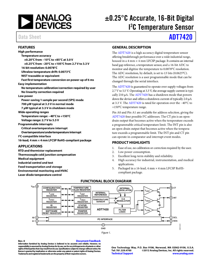 ADT7420: ±0.25°C Accurate, 16-Bit Digital IC Temperature Sensor