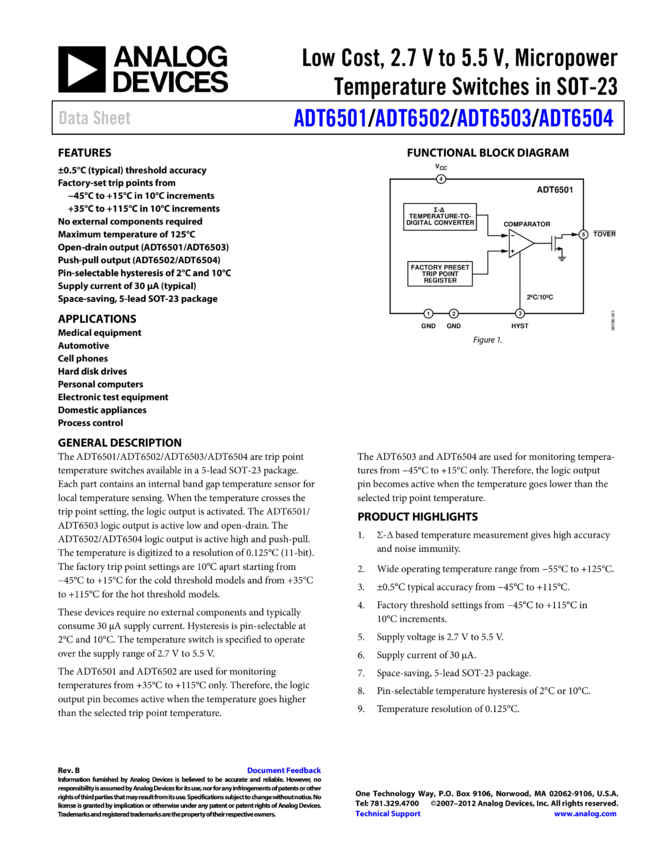 ADT6501: Low Cost, 2.7 V to 5.5 V, Micropower Temperature Switch in SOT-23 (Monitors Temps from +35°C to +115°C)