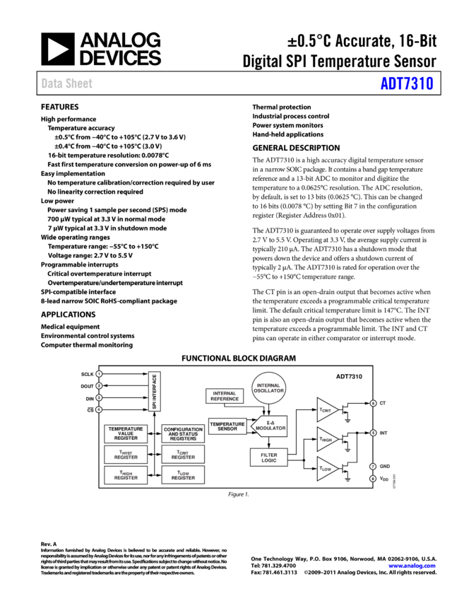 ADT7310: ±0.5°C Accurate, 16-Bit Digital SPI Temperature Sensor