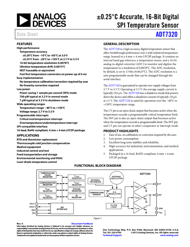 ADT7320: ±0.25°C Accurate, 16-Bit Digital SPI Temperature Sensor