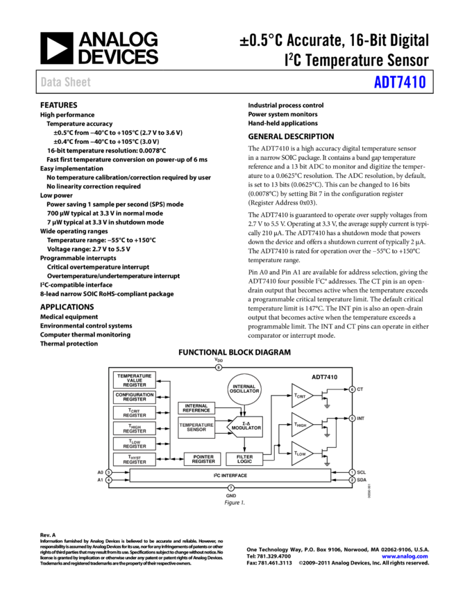 ADT7410: ±0.5°C Accurate, 16-Bit Digital IC Temperature Sensor