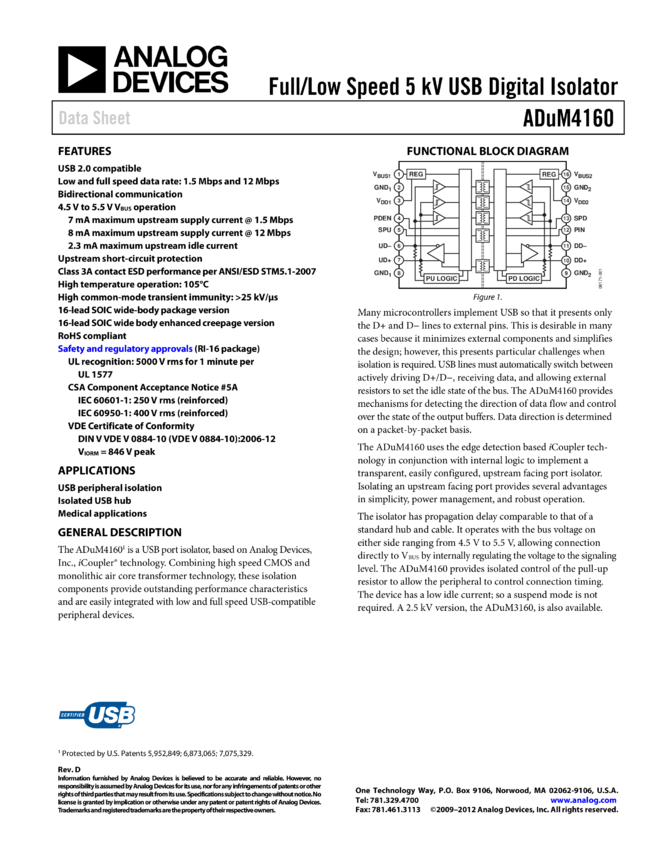 ADUM4160: Full/Low Speed USB Digital Isolator