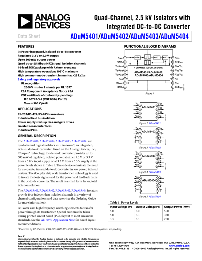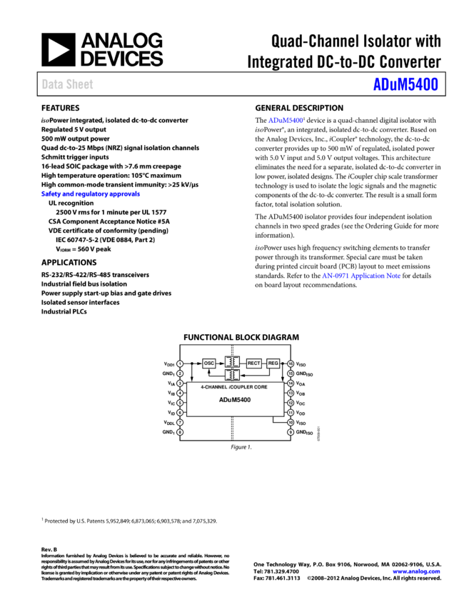 ADUM5400: Quad-Channel Isolator with Integrated DC-to-DC Converter (4/0 channel directionality)