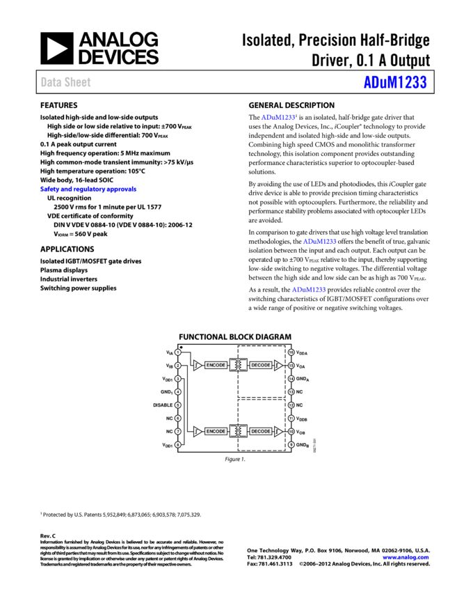 ADUM1233: Isolated, Precision Half-Bridge Driver, 0.1 A Output