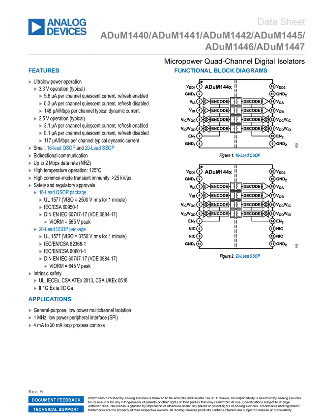 ADUM1447: Micropower Quad-Channel Digital Isolator, Default Low (2/2 Channel Directionality)