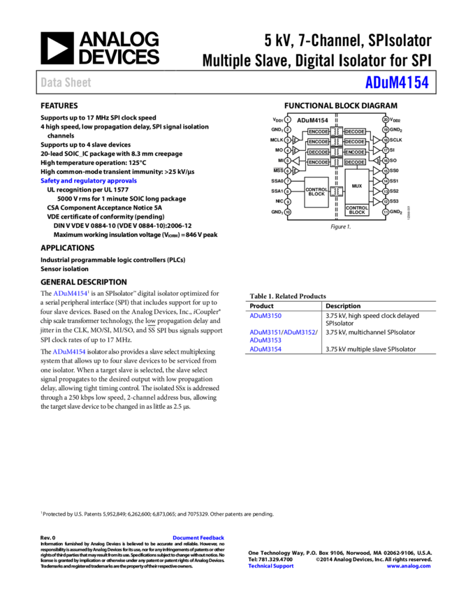 ADUM4154: 5 V, Dedicated Isolators for SPI Interfaces (with Control for up to 4 Slaves)