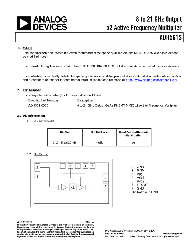Aerospace GaAs, Broadband Frequency Multiplier, 8 to 21 GHz, Die