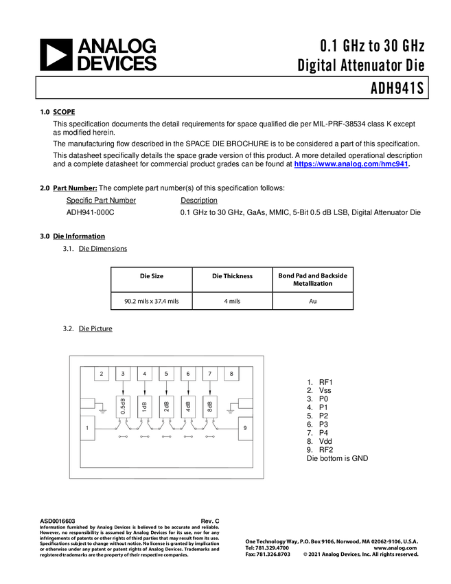 Aerospace 0.1 GHz to 30 GHz, GaAs, MMIC, 5-Bit 0.5 dB LSB, Digital Attenuator