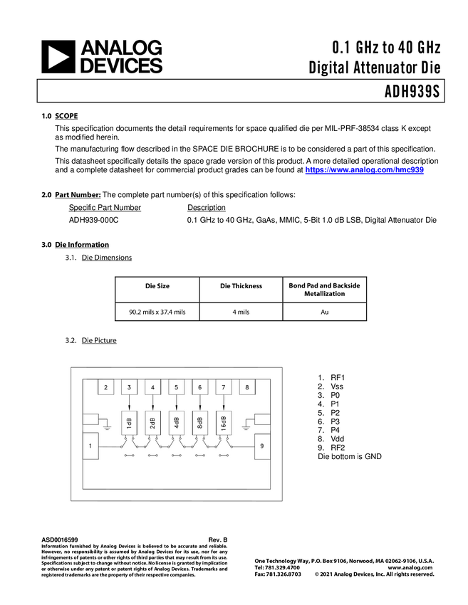 Aerospace 0.1 GHz to 40 GHz, GaAs, MMIC, 5-Bit 1.0 dB LSB, Digital Attenuator
