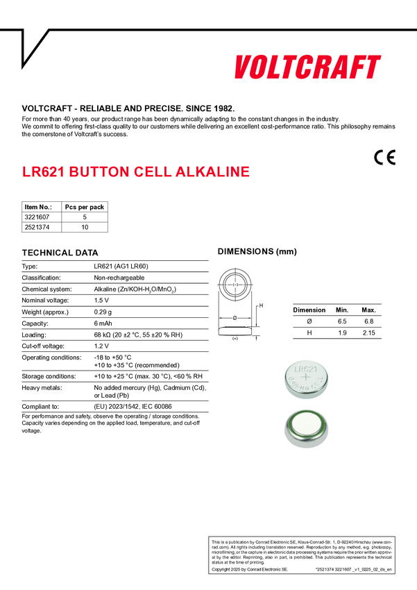 Ogniwo guzikowe LR 621 VOLTCRAFT AG1 10 szt. 6 mAh alkaliczno-manganowe