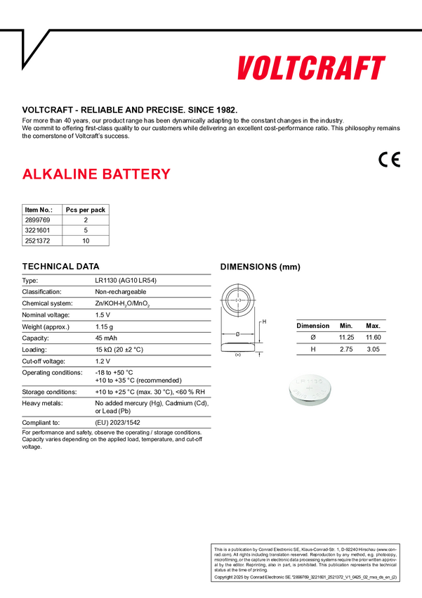Ogniwo guzikowe LR 1130 VOLTCRAFT AG10 10 szt. alkaliczno-manganowe