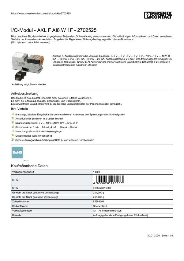 Moduł I/O Phoenix Contact AXL F AI8 W 1F 2702525, 1 szt.