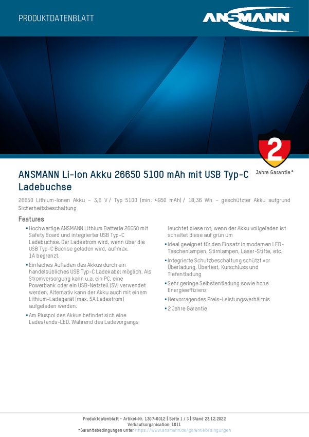 USB-C® Akku Ansmann 1307-0012, Li-Ion, 5100 mAh, 3.6 V, 1 szt.
