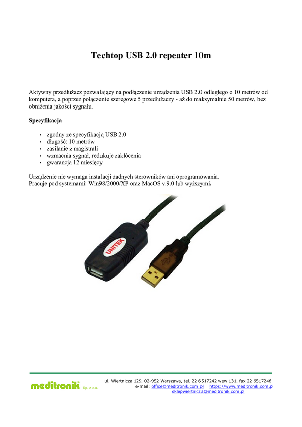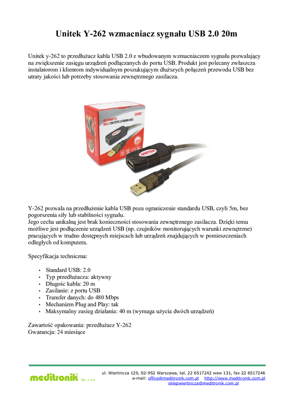 Unitek Y-274 Aktywny przedłużacz repeater USB A-A, 2.0, wtyk/gniazdo, długoś