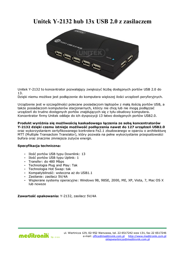 Unitek Y-2132 aktywny hub USB 2.0 13-portowy