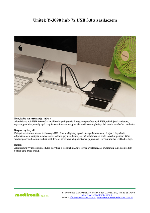 Unitek Y-3090, aktywny hub 7x port USB-A 3.0, wtyk USB-A, z zasilaczem