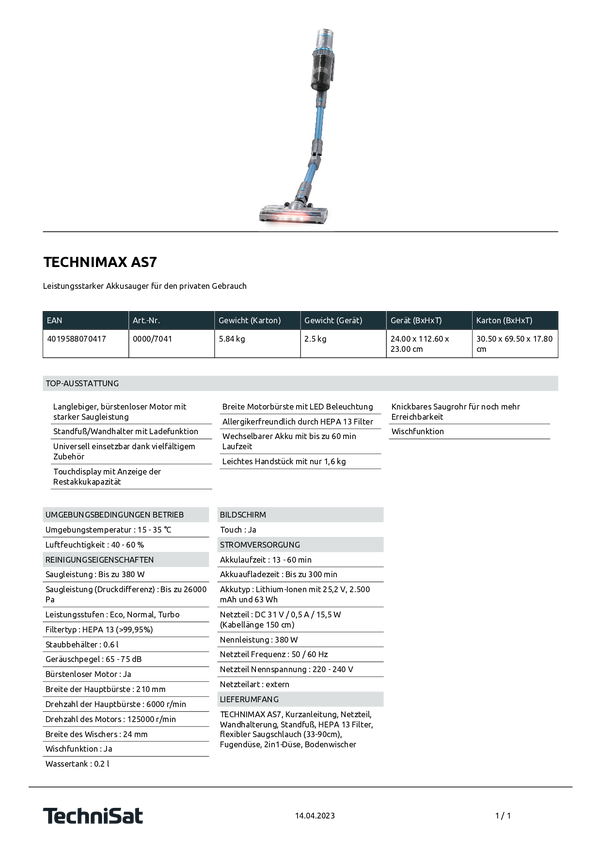 TechniSat TECHNIMAX AS7 0000/7041 Odkurzacz ręczny, akumulatorowy 25.2 V z akumulatorem, bezworkowy, funkcja przecierani