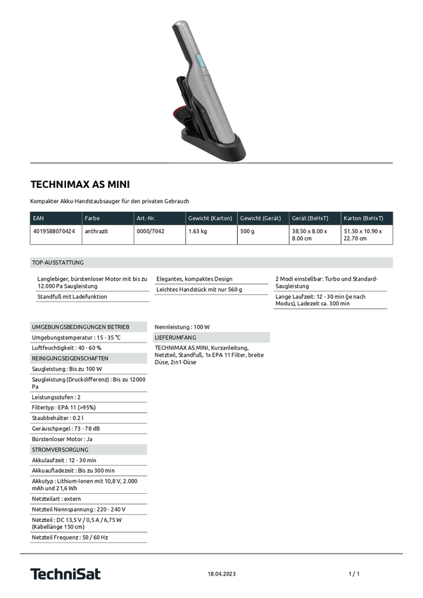 TechniSat TECHNIMAX AS MINI 0000/7042 Odkurzacz ręczny, akumulatorowy 10.8 V z akumulatorem, bezworkowy