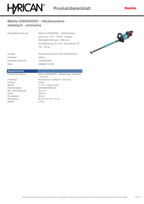 Makita UH004GD akumulatorowy Nożyce do żywopłotu 40 V Li-Ion 600 mm